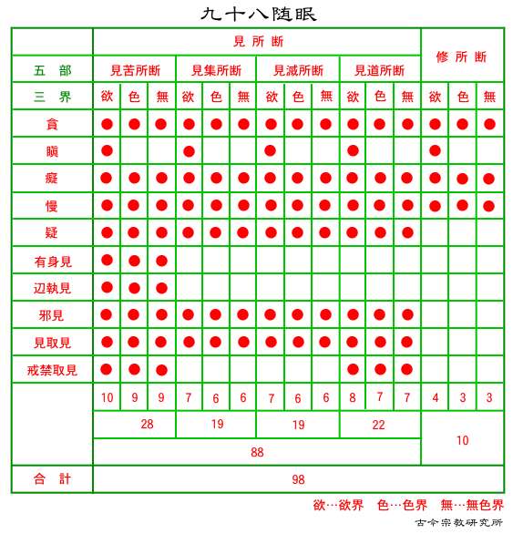 この十随眠は、学習と修行によって徐々に消滅していきます。その消滅の過程に基づいて98に細分化したのが九十八随眠です。